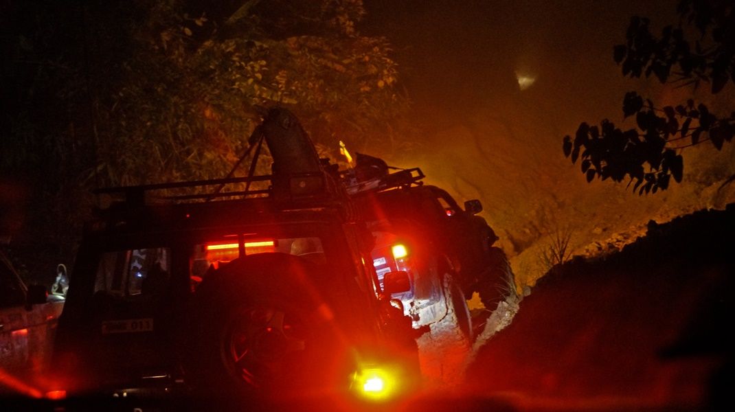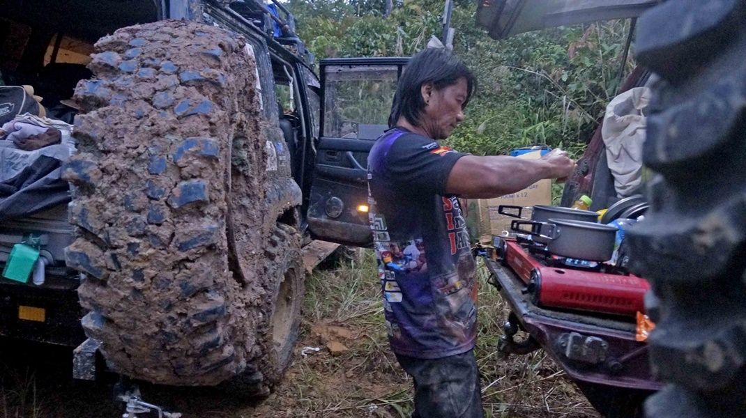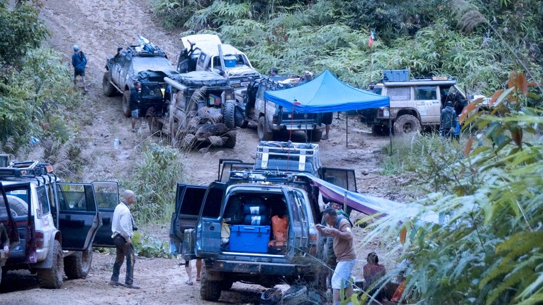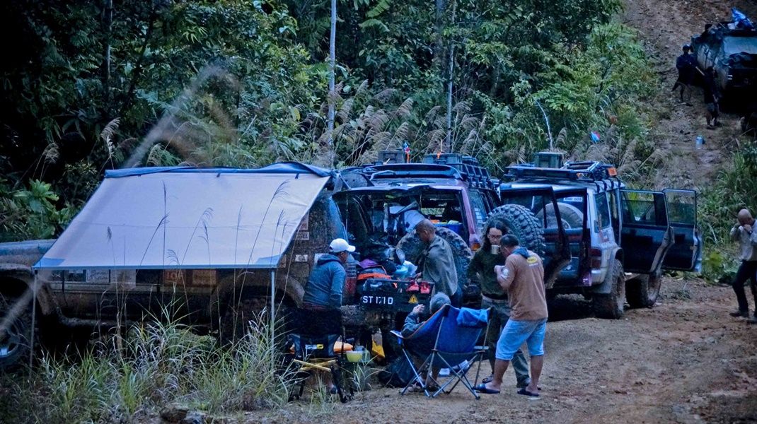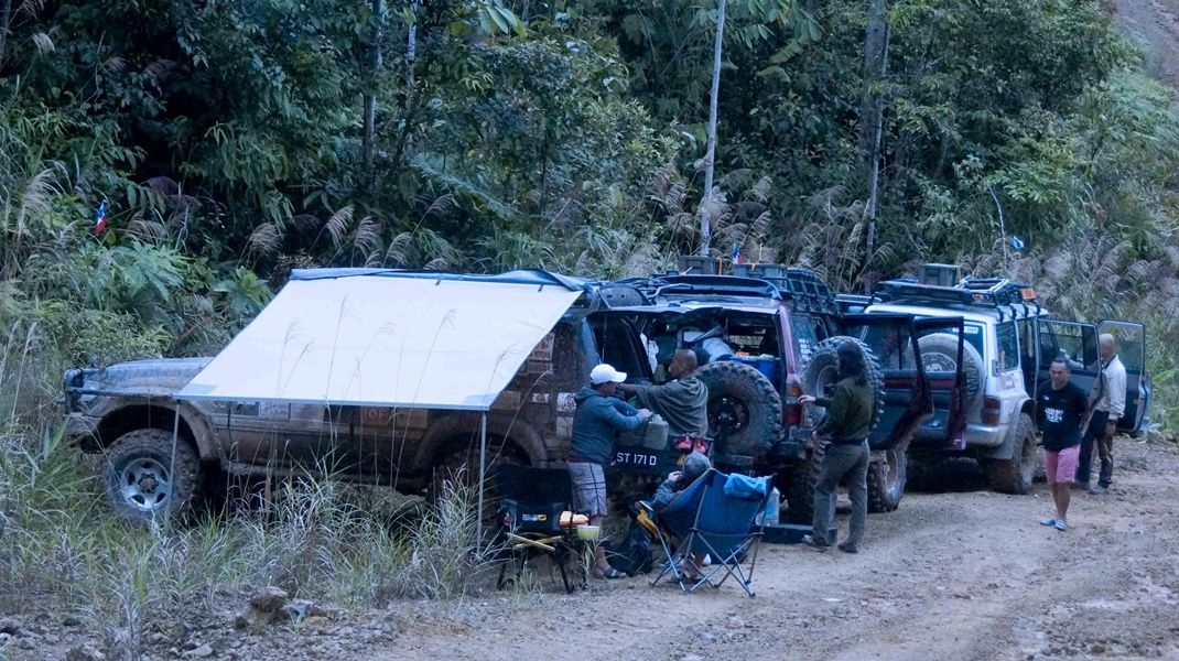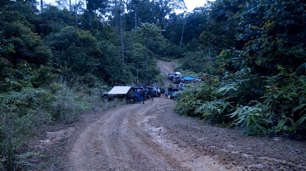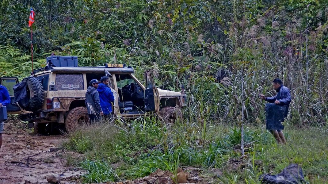 Day 6, December 2nd, The weather was very cold last night. The first group of convoy woke up early in the morning and began to climb up Mount Slukut the highest peak of Borneo in Kalimantan Indonesia at a height of 1,558 meters above sea level about halfway between Benuang Village Semamu distance 65 km. The first group of Convoy 10 cars started from the eighth kilometer moving approximately 500 meters found obstracle a large tree hundreds of years old falling block the road, using about an hour to cut and clear the tree. After that it were a long way tough, steep and dangerous mountains full of holes,channel, big and small rocks, Everyone were tiredness from walking up and down the high mountains for winching cars and had to using very long rope in many places. The steep and hard-core path seems like none stop. There were no big tree for winching , had to using ground anchor in difficult with a soft ground that pervades from rain which made the ground wet and slippery from liquid soil on the top. The toughest obstracles had more than 5-6 places. Man and machine had to fighting with hardcore heart and reach the summit of mountain Slukut at almost midnight and try to continue moving forward down from the peak of mountain but the way down from the mountain were still very dangerous in the darkness, therefore convoy group one had to stay overnight near the summit of Mount Slukut among the strong cold wind blowing and surrounding with the white mist.