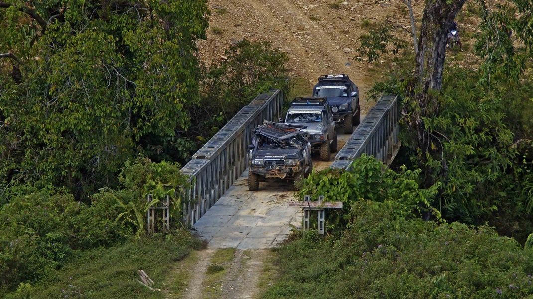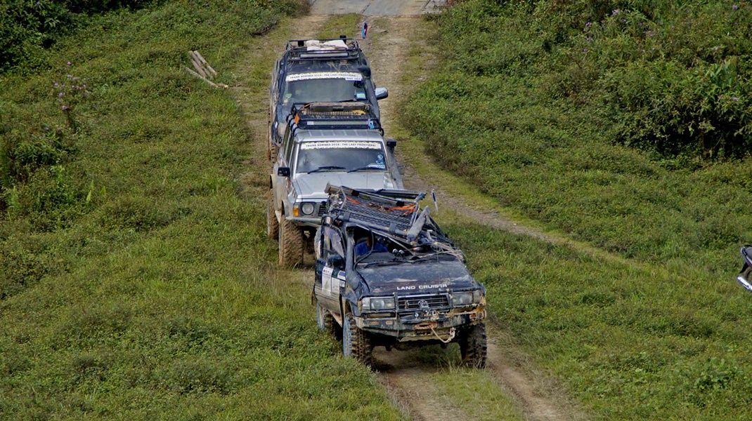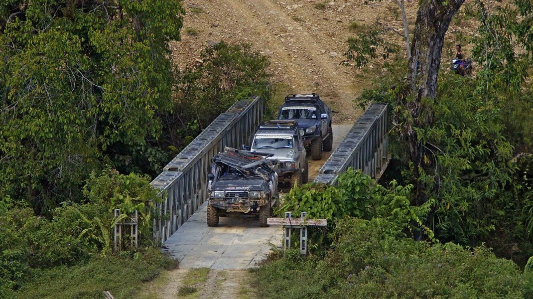 Day 7, December 3rd, the first group of 10 cars started to travel up the steep slope just under a hundred meters found the long hardcore obstracles with a line of stone like bridges full of many rutted waiting and the side were a deep abyss. And turning up to a rocky hill with many danger trenches to destroying the car's suspension along the hill road. The last hundred meters were a road that creates a large long rutting which tough and brutally, on this obstracle had to using winch by ground anchor and a large tree stump helps to winching. All 10 cars of first group spent 7 hours for passing the last hardcore obstracles. But while traveling down hill to the village of Semamu an accident occurred when a car overturned on a steep curving turn, lucky no one were hurt and arrived at Semamu village on 10 p.m.