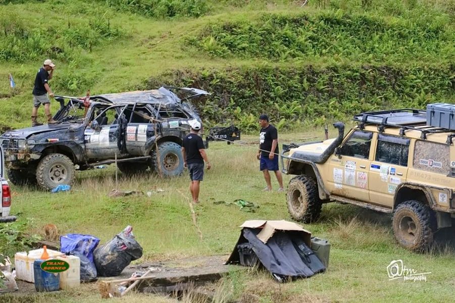 Day 7, December 3rd, the first group of 10 cars started to travel up the steep slope just under a hundred meters found the long hardcore obstracles with a line of stone like bridges full of many rutted waiting and the side were a deep abyss. And turning up to a rocky hill with many danger trenches to destroying the car's suspension along the hill road. The last hundred meters were a road that creates a large long rutting which tough and brutally, on this obstracle had to using winch by ground anchor and a large tree stump helps to winching. All 10 cars of first group spent 7 hours for passing the last hardcore obstracles. But while traveling down hill to the village of Semamu an accident occurred when a car overturned on a steep curving turn, lucky no one were hurt and arrived at Semamu village on 10 p.m.