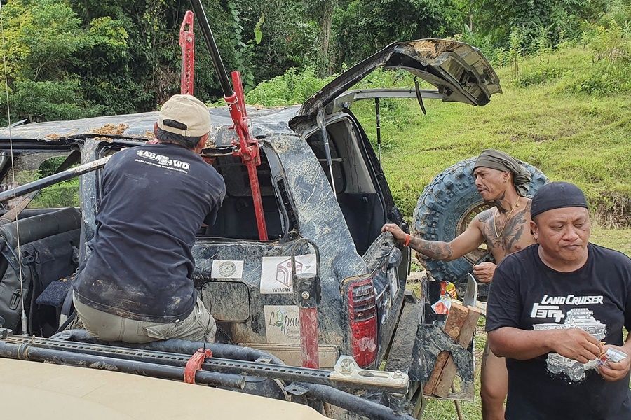 Day 8, December 4th, The ten vehicles of first group had to waiting for the second group 8 cars, so today were a relaxing day of the first off-road group. Everyone stayed in the homestay of Semamu Village. And the villagers went to fishing by fishhooks and fish net to catch a big fish to sale to offroaders which it were famous fish for the most delicious taste and also very expensive of Barob fish and Pelian fish, in the market price up to 900 -1,500 ringgit (8,100 - 10,500 baht) per 1 kg. And as well as helping to recovery the overturned car on the road which was about 5 km away from the village, brought down near the crossroads before into the village. In the evening there had good news, could contact the second group via radio and knew that they had fought hard to the top of Mount Slukut but bad luck had a few cars complete to driving and had to camp overnight on top of the hill surrounded with a strong wind, cold air covered by white clouds and fog.