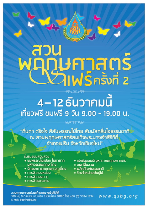 เนื่องในวโรกาสมหามงคลเฉลิมพระชนมพรรษาพระบาทสมเด็จพระเจ้าอยู่หัวฯ 5 ธันวาคม 2554 องค์การสวนพฤกษศาสตร์ ขอเชิญร่วมงานสวนพฤกษศาสตร์แฟร์ ครั้งที่ 2 พบกิจกรรมรื่นรมย์ ชมสวนสวย ร่วมชมการจัดนิทรรศการให้ความรู้เกี่ยวกับงานด้านพฤกษศาสตร์ พบกับพืชพรรณไม้แปลก ไม้หายาก หลากชนิดชมการจัดสวนหย่อม สวนถาด การจัดช่อดอกไม้ การแข่งขันการตอบปัญหาทางพฤกษศาสตร์ระดับภาคเหนือ เพลิดเพลินกับความไพเราะของดนตรีในสวน รวมทั้งได้เพลิดเพลินกับการจับจ่ายใช้สอยในผลิตภัณฑ์ธรรมชาติและพรรณไม้นานาชนิดราคาพิเศษ เที่ยวฟรี ชมฟรี 9 วัน ทั้งนี้ตั้งแต่วันที่ 4 - 12 ธันวาคมนี้ 9.00 น. ถึง 19.00 น. ณ สวนพฤกษศาสตร์สมเด็จพระนางเจ้าสิริกิติ์ อำเภอแม่ริม จังหวัดเชียงใหม่