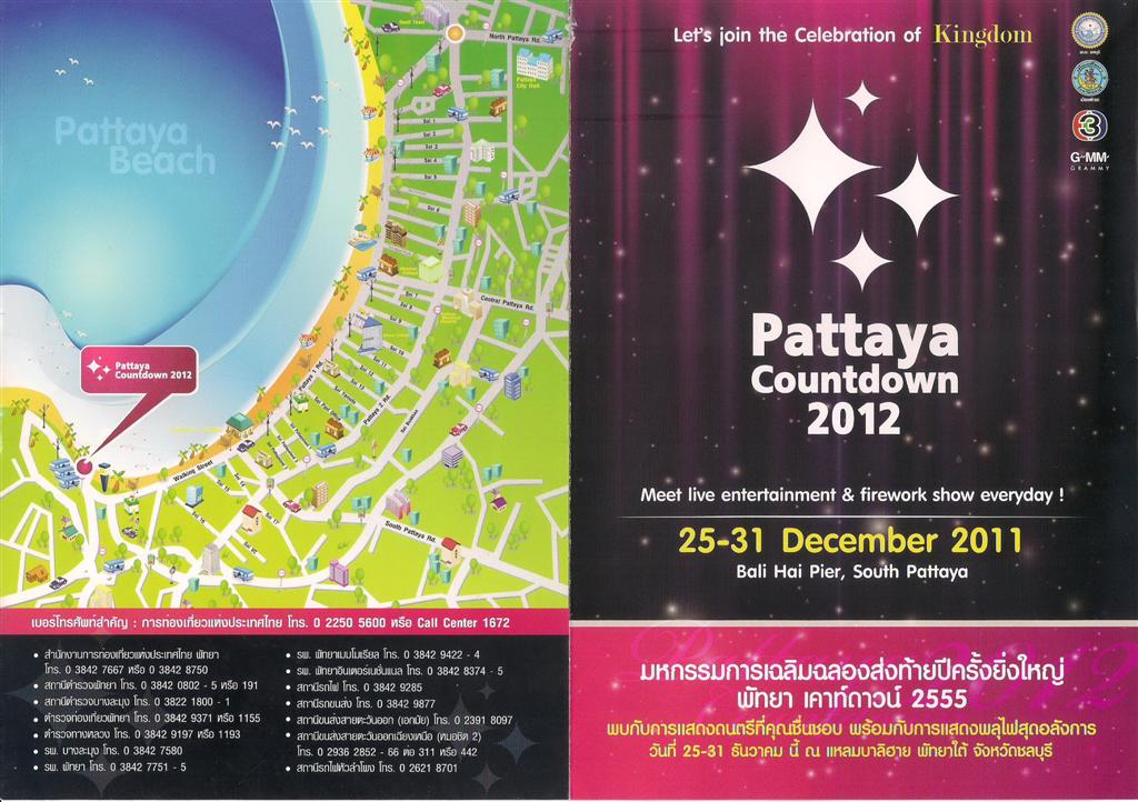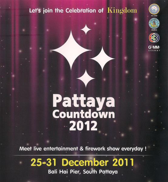 เมืองพัทยา ,การท่องเที่ยวแห่งประเทศไทย (ททท.) สำนักงานพัทยา ,สถานีวิทยุโทรทัศน์ไทยทีวีสีช่อง 3 และ GMM GRAMMY ร่วมจัดงานส่งท้ายปีเก่า ต้อนรับปีใหม่ 2555 หรือ Pattaya Countdown 2012 ตั้งแต่วันที่ 25-31 ธ.ค. บริเวณท่าเทียบเรือท่องเที่ยวแหลมบาลีฮาย พัทยาใต้
