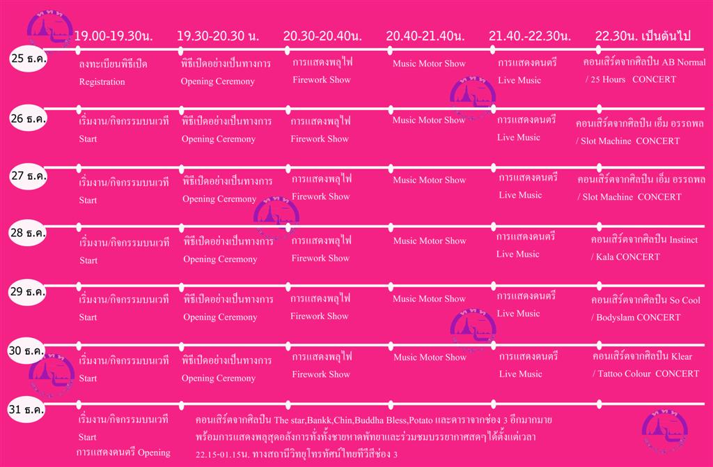 ทั้งนี้ในปีนี้ ได้มีการนำเอาศิลปินชื่อดังในเครือ GMM Grammy มาร่วมแสดงคอนเสิร์ต ทั้ง เอบีนอมอล, 25 Hours, กะลา, แทททูคัลเลอร์, บอร์ดี้สแลม, ซีล, กลุ่มก้านคอคลับ, โปเตโต้, แบงก์ วงแคลซ, สล็อตแมทชีน และอื่นๆ อีกมาก โดยจะหมุนเวียนเปลี่ยนกันขึ้นเวทีเรียกความสนุกสนานจากผู้เข้าร่วมงาน ซึ่งเชื่อว่ากิจกรรมในปีนี้ จะมีความยิ่งใหญ่และได้รับความสนใจจากนักท่องเที่ยวอย่างแน่นอน