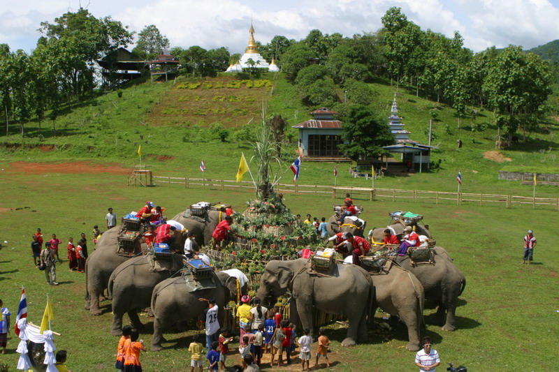 ถวายสังฆทานแด่พระสงฆ์ ภาพของควาญช้างผูกข้อเท้าให้ช้างของตนเองเหมือนลูกเหมือนหลาน และภาพของช้างสิบกว่าเชือก ที่เอร็ดอร่อยกับบรรดาผลไม้ที่กองสูงเกือบ 10 เมตรนั้น นับเป็นภาพความงดงามทางวัฒนธรรมที่น่าดูน่าชม และสร้างความประทับใจให้กับผู้ที่ได้พบเห็นเป็นอย่างมาก ซึ่งทั้งหมดนี้จะหาชมที่ไหนไม่ได้ นอกจากในงาน "ไอยราปาร์ตี้" ที่บ้านใหม่พัฒนา อำเภอสังขละบุรี จังหวัดกาญจนบุรี เพียงที่เดียว