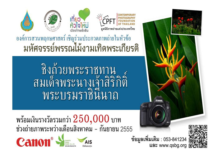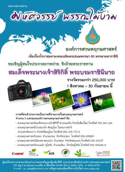 จึงขอเชิญชวนประชาชนผู้สนใจเข้าร่วมประกวดภาพถ่าย “มหัศจรรย์พรรณไม้งามเทิดพระเกียรติสมเด็จพระนางเจ้าสิริกิติ์ พระบรมราชินีนาถ” ซึ่งนอกจากจะได้เข้าร่วมกิจกรรมเทิดพระเกียรติ ในครั้งนี้แล้ว ผู้เข้าร่วมกิจกรรมจะได้สัมผัสคุณค่าแห่งธรรมชาติ มหัศจรรย์แห่งพืชพรรณความงดงามของพรรณไม้ไทยพร้อมกับบรรยากาศอันน่ารื่นรมย์ของแต่ละสวนสาขาอีกด้วย สามารถสอบถามข้อมูลเพิ่มเติมได้ที่ www.qsbg.org และงานประชาสัมพันธ์: