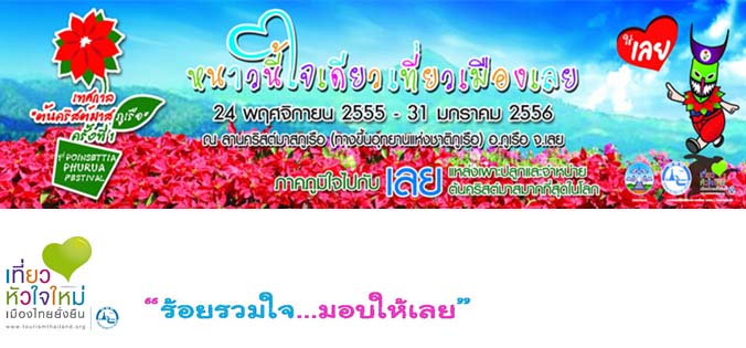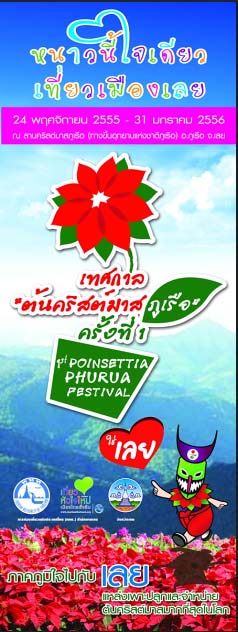 การท่องเที่ยวแห่งประเทศไทย (ททท.) สำนักงานเลย ขอเชิญท่านเข้าร่วมอีกหนึ่งกิจกรรมของ “หนาวนี้ใจเดียว เที่ยวเมืองเลย...เทศกาลต้นคริสต์มาสภูเรือ ครั้งที่ ๑” ระหว่างวันที่ ๒๔ พฤศจิกายน ๒๕๕๕-๓๑ มกราคม ๒๕๕๖ ณ ลานคริสต์มาสภูเรือ (ทางขึ้นอุทยานแห่งชาติภูเรือ) อำเภอภูเรือ จังหวัดเลย