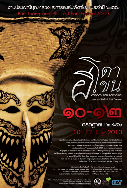 การท่องเที่ยวแห่งประเทศไทย (ททท.) สำนักงานเลย ขอเชิญผู้ที่สนใจร่วมงานประเพณี บุญหลวงและการละเล่นผีตาโขน ปี 2556 ในวันที่ 10-12 กรกฎาคม 2556 ณ หน้าที่ว่าการอำเภอด่านซ้าย วัดโพนชัย และถนนแก้วอาสา อำเภอด่านซ้าย จังหวัดเลย
