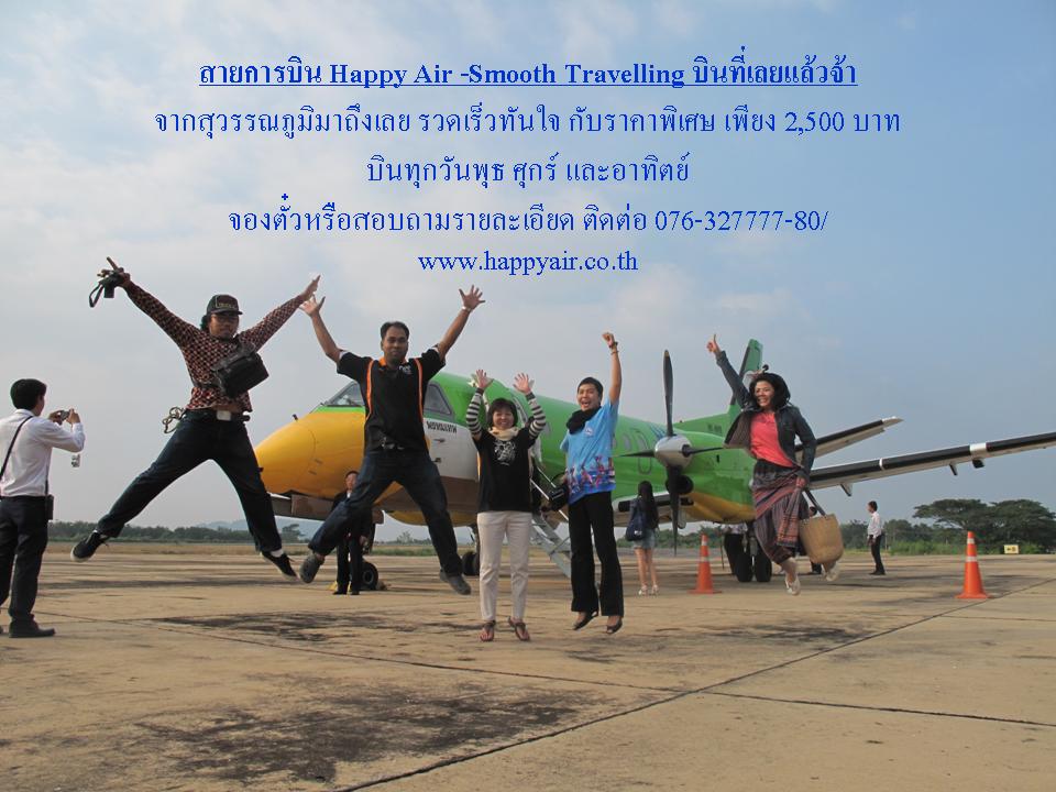 สายการบิน Happy Air-Smooth Travelling บินที่จังหวัดเลยแล้ว...จากสุวรรณภูมิถึงเลยรวดเร็วทันใจกับราคาพิเศษเพียง 2,500 บาท บินทุกวันพุธวันศุกร์และวันอาทิตย์จองตั๋วหรือสอบถามรายระเอียด ติดต่อ 076-327-777-80 หรือ www.happyair.co.th