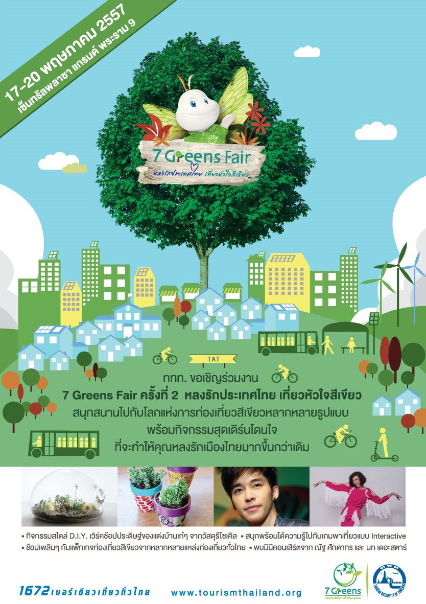 "7 Greens Fair" ครั้งที่ 2 ปี 2557 ภายใต้แนวคิด "หลงรักประเทศไทย เที่ยวหัวใจสีเขียว" ระหว่างวันที่ 17 - 20 พฤษภาคม 2557 ณ ห้างสรรพสินค้าเซ็นทรัลพลาซ่า แกรนด์ พระรามเก้า โดยมีวัตถุประสงค์เพื่อ เป็นการกระตุ้นให้ผู้ประกอบการในอุตสาหกรรมท่องเที่ยว และประชาชนทั่วไปเกิดความตระหนักและมีส่วนร่วมส่งเสริมให้เกิดการท่องเที่ยวอย่างยั่งยืน และเกิดภาพลักษณ์ที่ดีของประเทศในการเป็นจุดหมายปลายทางที่ ใส่ใจสิ่งแวดล้อม