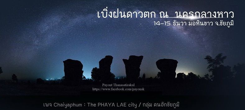 จังหวัดชัยภูมิ โดย สถานีหางดงเชียงใหม่ กลุ่มคนดูดาว www.facebook.com/ThePhayaLaeCity และกลุ่มคนฮักชัยภูมิ สนับสนุนการประชาสัมพันธ์โดย การท่องเที่ยวแห่งประเทศไทย(ททท.)สำนักงานนครราชสีมา ขอเชิญทุกท่านร่วมชมความสวยงามท่ามกลางความมหัศจรรย์ ฝนดาวตกคนคู่ อยู่ในนครกลางหาว มอหินขาว ชัยภูมิ ระหว่างวันที่ 14 15 ธันวาคม 2557 ณ มอหินขาว อำเภอเมือง จังหวัดชัยภูมิ