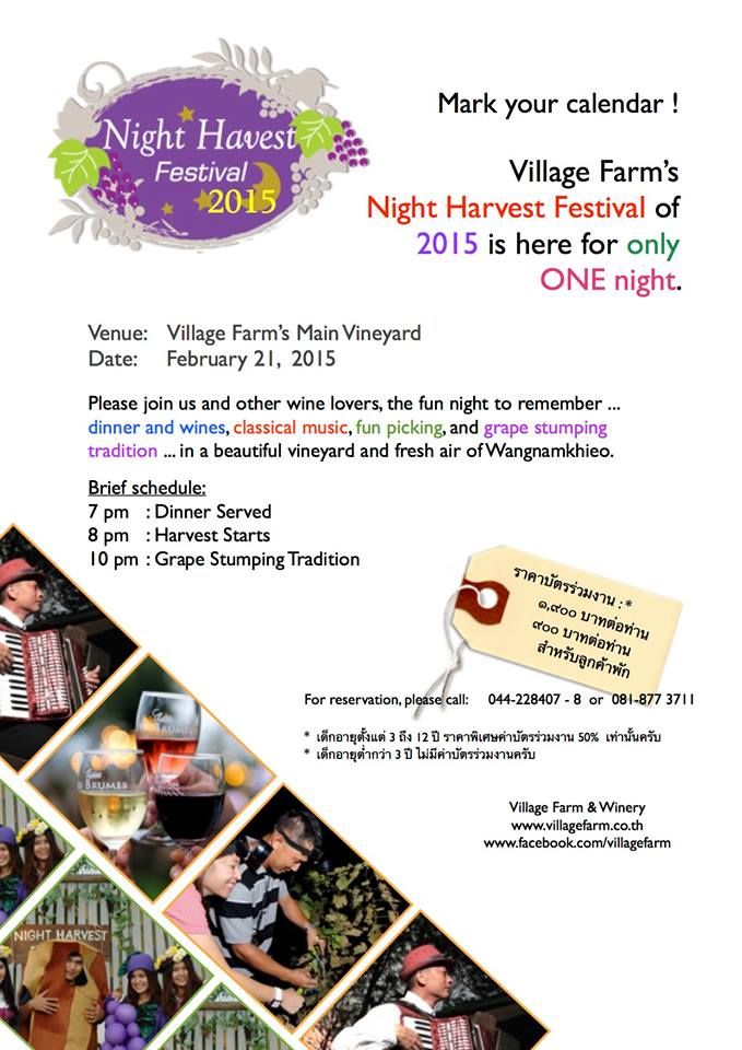 ไร่องุ่นวิลเลจฟาร์ม แอนด์ไวน์เนอรี่ อำเภอวังน้ำเขียว จังหวัดนครราชสีมา สนับสนุนการประชาสัมพันธ์โดย การท่องเที่ยวแห่งประเทศไทย(ททท.)สำนักงานนครราชสีมา จัดเทศกาลแห่งความสุข เทศกาลเก็บเกี่ยวองุ่นไวน์ ประจำปี 2558 Village Farms สำหรับกิจกรรมการจัดงาน เริ่มต้นด้วยบรรยากาศ แห่งความสวยงามท่ามกลางไร่องุ่นไวน์ของวิลเลจฟาร์มอันกว้างใหญ่ รายล้อมด้วยวิวเทือกเขาสลับซับซ้อนสวยงามตามความรู้สึกของใครหลายๆคนที่ชื่นชอบผลิตภัณฑ์ที่เกิดจากองุ่นสายพันธุ์ดี สนุกสนานดื่มด่ำกับอาหารชั้นเลิศจากกุ๊กฝีมือเยี่ยม และไวน์ที่