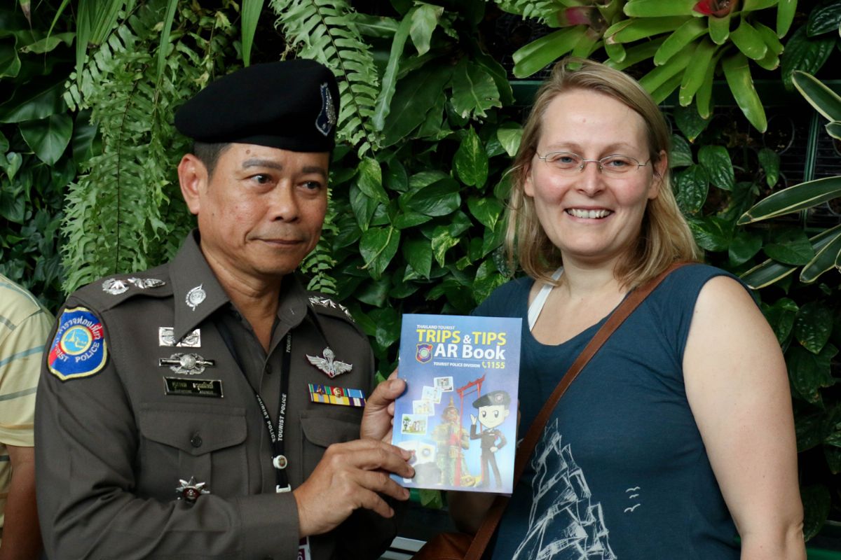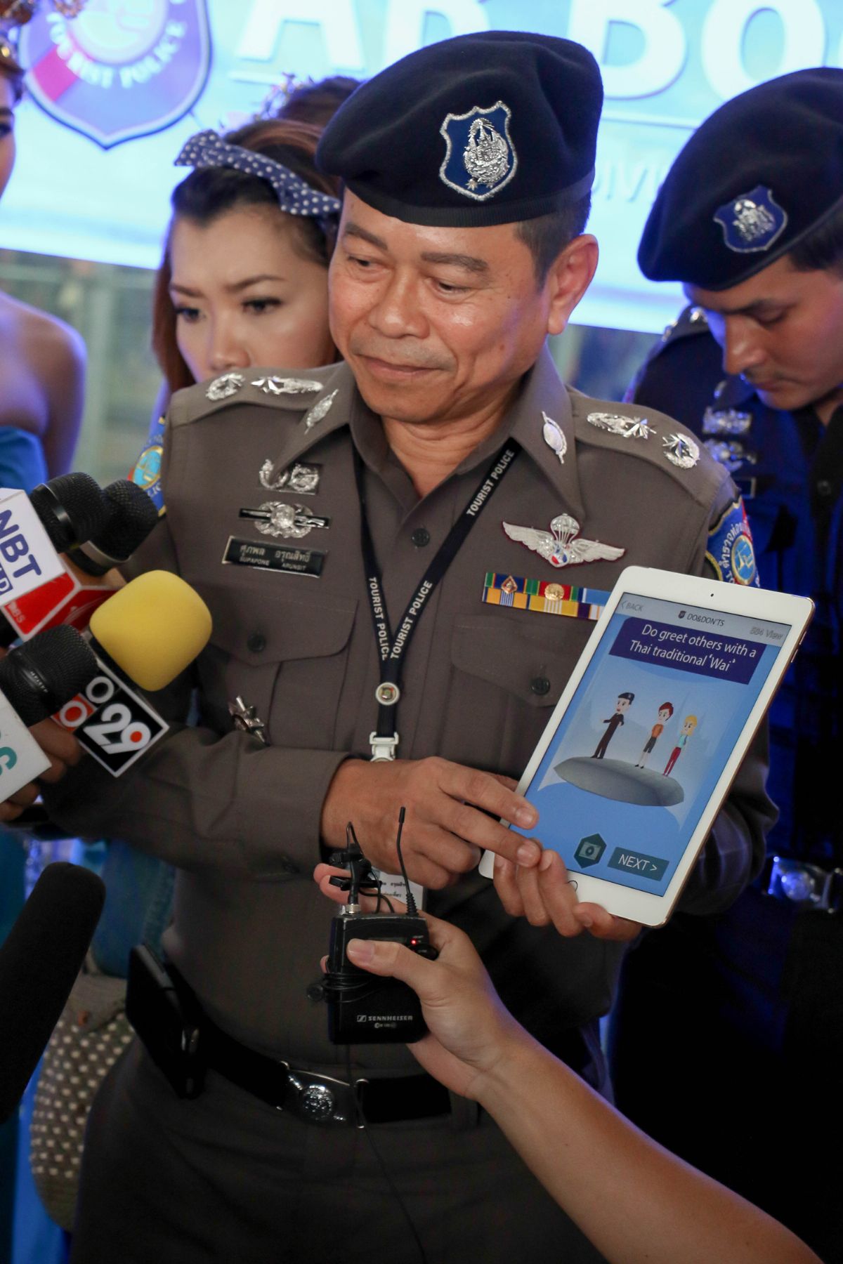 ผู้บังคับการตำรวจท่องเที่ยว กล่าวต่อว่า ‘Thailand Tourist Trips and Tips AR Book’ คือการจัดทำ แอพพลิเคชั่นเสมือนจริงของกองบังคับการตำรวจท่องเที่ยวขึ้น เพื่อให้นักท่องเที่ยวสามารถดาวน์โหลดแอพพลิเคชั่นลงในสมาร์ทโฟนของตนเอง ซึ่งในแอพพลิเคชั่นเสมือนจริงนี้ จะให้ข้อมูลกับการขยายความเข้าใจในการแนะนำวัฒนธรรมไทยและการปฏิบัติตัวที่ถูกต้องในเบื้องต้นที่ควรรรู้ เกี่ยวกับสิ่งที่ควรทำและไม่ควรทำในขณะท่องเที่ยวอยู่ในประเทศไทย พร้อมข้อมูลและลิ้งค์ของสถานที่ตั้งของแหล่งท่องเที่ยววิถีไทย 12 จังหวัดที่ต้องห้าม...พลาด ง่ายต่อการวางแผนการเดินทาง ในรูปแบบของโมเดลการ์ตูน 3 มิติ สามารถดูได้ 360°องศา รับฟังได้ถึง 3 ภาษา ได้แก่ ภาษาไทย ภาษาอังกฤษ และภาษาจีน เพื่อดึงดูดให้เด็กสนใจและยังเป็นความรู้ทางด้านสังคมศาสตร์และวัฒนธรรมอีกด้วย นอกจากนี้ที่สำคัญมีข้อมูลและลิ้งค์ที่ตั้งของสถานีตำรวจท่องเที่ยวทั่วประเทศและข้อมูลการติดต่อกับตำรวจท่องเที่ยวทุกสถานีทั่วประเทศ รวมถึงสายด่วน 1155 ที่นักท่องเที่ยวสามารถโทรออกผ่านแอพพลิเคชั่นนี้ได้ทันที เพื่อความสะดวกและการดูแลรักษาความปลอดภัยให้กับนักท่องเที่ยว เพื่อให้การปฏิบัติภารกิจของกองบังคับการตำรวจท่องเที่ยวเกิดประสิทธิภาพสูงสุดและเหมาะสมกับสภาวการณ์ในปัจจุบัน และให้นักท่องเที่ยวเห็นถึงศักยภาพของตำรวจท่องเที่ยวในความก้าวล้ำ ทันสมัยที่ไม่เคยหยุดยั้งและความมุ่งมั่นตั้งใจของตำรวจท่องเที่ยวไทยในการพัฒนาการให้บริการ ช่วยเหลือ เอื้ออำนวยความสะดวก ดูแลรักษาความปลอดภัยในชีวิตและทรัพย์สินให้กับนักท่องเที่ยวทุกท่าน