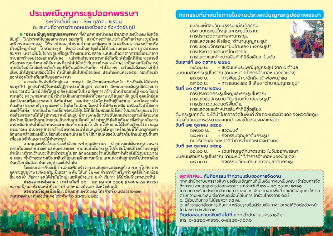จังหวัดชัยภูมิ จัดโดย อำเภอหนองบัวแดง และหน่วยงานภาครัฐและภาคเอกชน กำหนดจัดงานประเพณีที่ยิ่งใหญ่ ในช่วงวันออกพรรษาของทุกปี ประเพณีบุญกระธูปออกพรรษา จังหวัดชัยภูมิ ประจำปี ๒๕๖๑ ระหว่างวันที่ ๒๐ ๒๓ ตุลาคม ๒๕๖๗๑ ณ บริเวณถนนสายกระธูป หน้าที่ว่าการอำเภอหนองบัวแดง อำเภอหนองบัวแดง จังหวัดชัยภูมิ