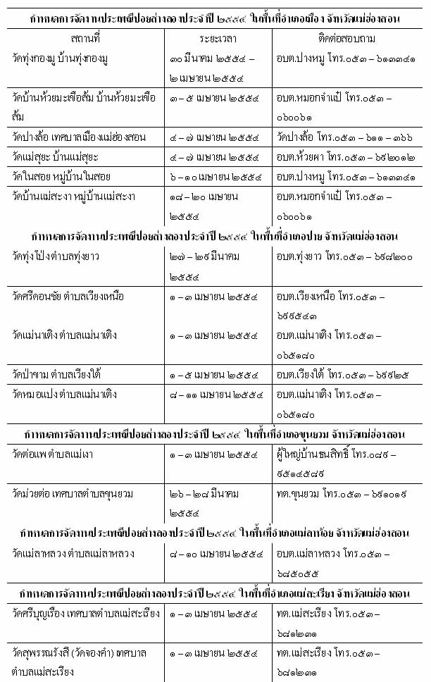 กำหนดการประเพณีปอยส่างลองประจำปี ๒๕๕๔ ในพื้นที่จังหวัดแม่ฮ่องสอน