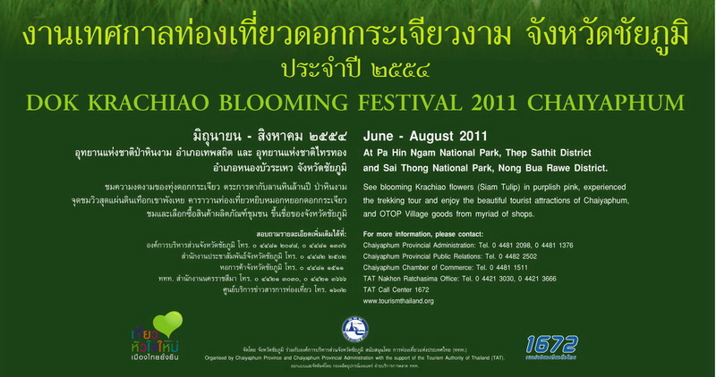 นายอรรถพล วรรณกิจ ผู้อำนวยการ ททท. สำนักงานนครราชสีมา เผยว่า ความสวยงามของทุ่งหญ้าเพ็กสีเขียวและความสดใสของดอกกระเจียวสีชมพูอมม่วงที่ล้อสายหมอก หยอกสายลมในช่วงหน้าฝนที่ใครหลายคนคิดว่าเป็นฤดูที่แตกต่าง งานเทศกาลท่องเที่ยวดอกกระเจียวงาม จังหวัดชัยภูมิ ประจำปี ๒๕๕๔ ที่จัดขึ้น ณ อุทยานแห่งชาติป่าหินงาม อำเภอเทพสถิต