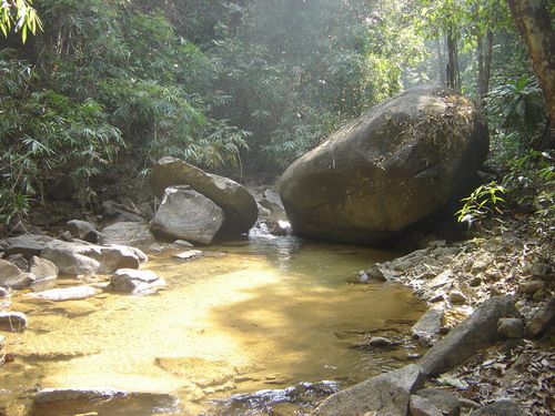 หินกลางลำธารก้อนใหญ่ น้ำใส ทรายขาว
