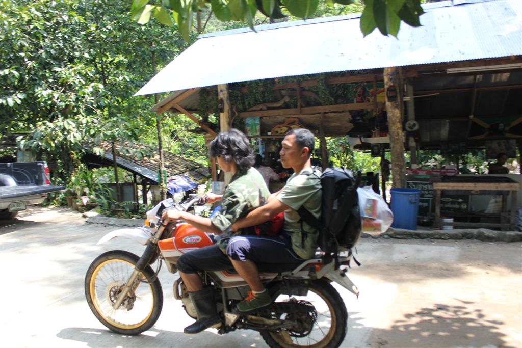 เพื่อร่นระยะเวลาในการเดินของเรา เลยใช้บริการมอไซด์ ประจำถิ่น ที่มีใช้มากมายในการตอนผลผลิตออกจากสวน ไปตามทางแคบ ผ่านสวนในช่องหุบเขา ใช้เวลานั่งสัก สิบกว่านาที ก็ตื่นเต้นไปอีกแบบ แต่เนื่องจากช่วงนี้กำลังยุ่ง ๆกันอยู่กับสวนเลยมีรถแค่สองคันมาให้บริการก็ต้องรอกัน