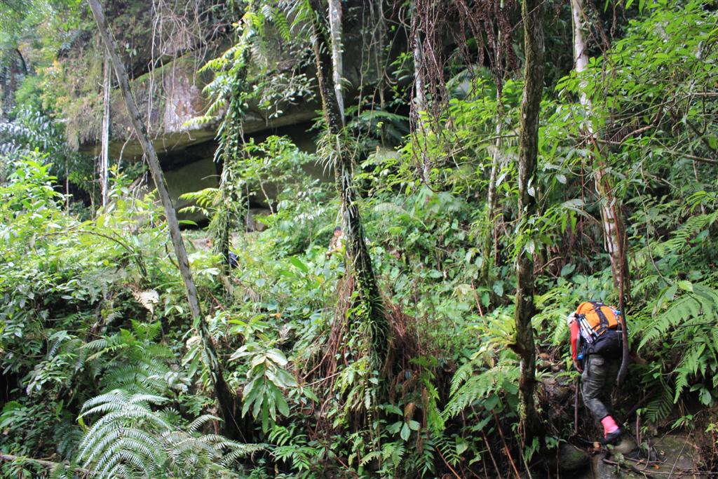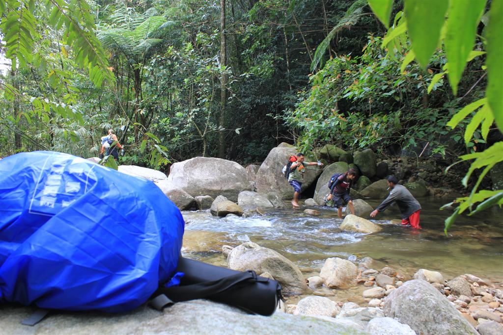 จากจุดข้ามคลองมาฝั่งนี้ รถมาไม่ได้ เลยเริ่มลงเดินกันครับ การเดินในช่วงแรก2-3 ชั่วโมงจะเป็นเส้นทางเลาะเลียบลำคลอง ไต่ระดับแบบไม่หนักมาก เป้าหมายคือที่พักตีนเขาส่วนที่ชันมาก แต่ช่วงที่พ้นสายน้ำจะเป็นป่าโปโปร่งไปอีก3-4 ชั่วโมง วันแรกเดินเรื่อย ๆ ถือว่าใม่หนักมาก