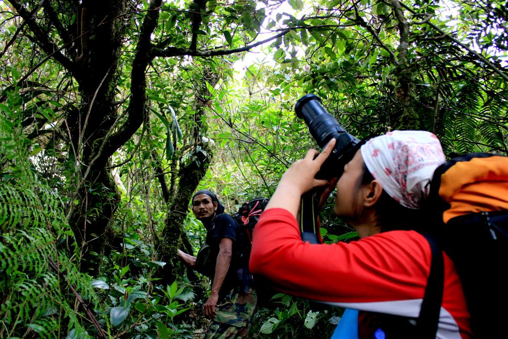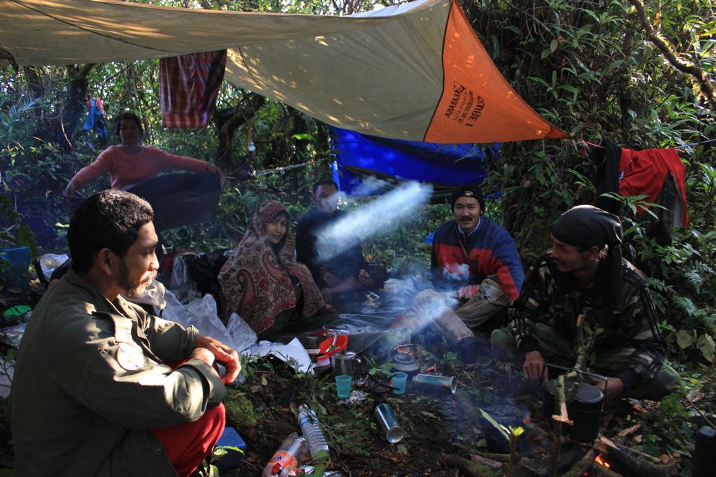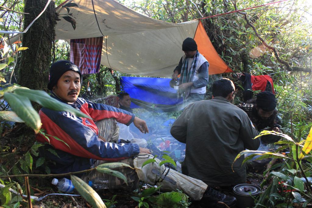 ด้านบนเป็นลานหญ้ารกหนาแน่น ปะปนกับหวายหนามกอเล็กต้องระวัง และมีทิวป่าโบราณเป็นสันและเหวด้านออกพอบังลมเราจะพักในป่าโบราณเตี้ยแคระ สูง 2-3 เมตร ด้านบนวันนี้เต็มไปด้วยหมอก ฟ้าปิดจนมืด หนาว เย็นแบบยะเยือก จากความชื้น