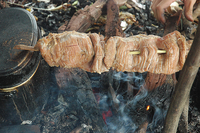 ระหว่างรอก็ถอนเหล้าสี่ห้าอึกและย่างเนื้อไปพลาง สุขดีจริงๆ
