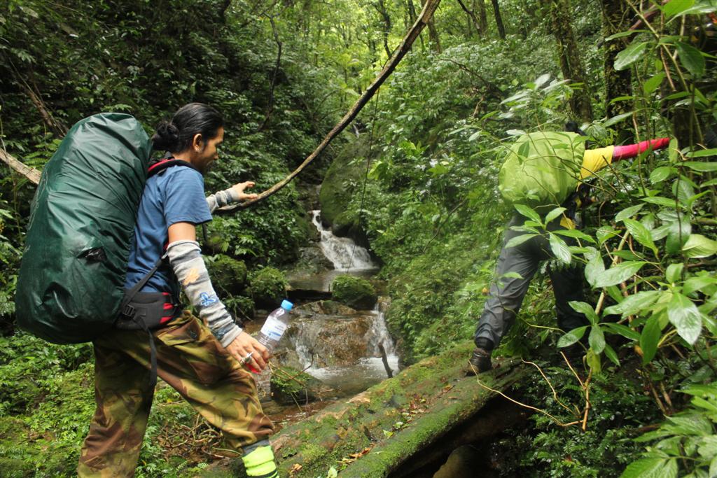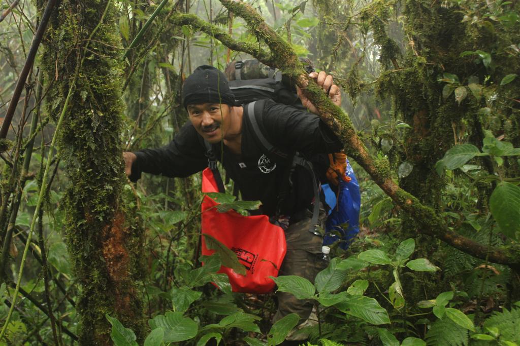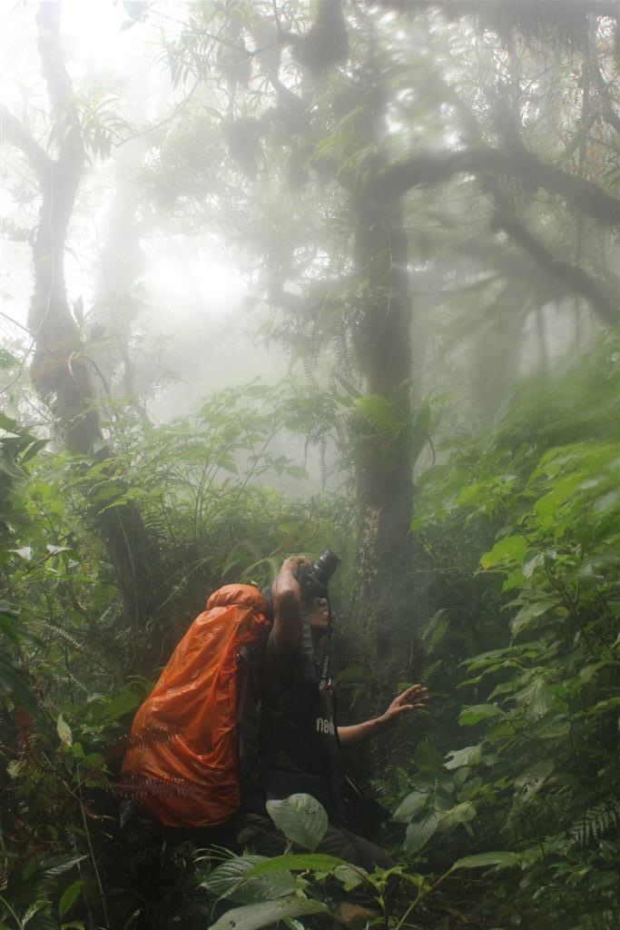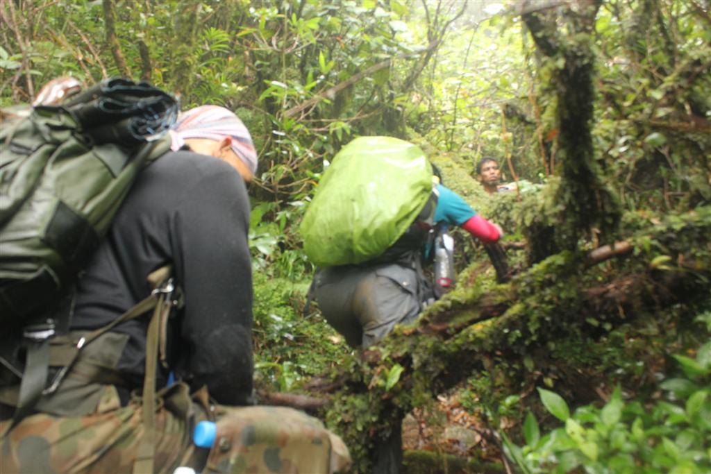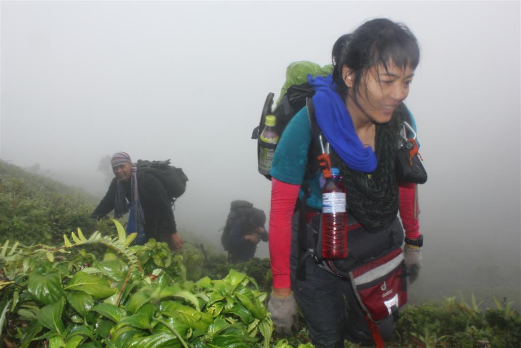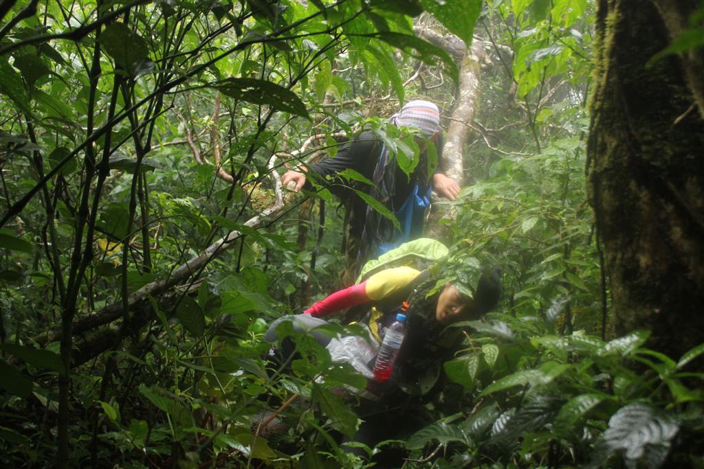 จากสันลมฝนเรา ก็ไต่สันบ้าง ทุ่งหญ้าบ้าง มุดเข้าป่าโบราณ ปีนป่าย ซึ่งสากรรณ์ ใช้ได้ จากเส้นทางที่ลื่นและชันเพื่อไปหายอดฝามี
