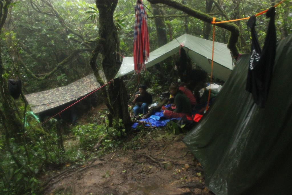 เราถึงยอดสันลมฝน ก็บ่ายแก่ ๆข้าวเที่ยงก็ลืมกินกันไปเลย จะกินก็จะเย็นเลยเป็นกินข้าวเย็นเสียทีเดียวเปลี่ยนชุดก็เป็นอาบน้ำไปเลย เพราะแค้มป์นี้มิมีสายห้วยร่องน้ำ ลงไปเอาน้ำพอใช้ทำกับข้าวเท่านั้น เปลี่ยนชุดก็นั่งมุด ฟังฝนพร่ำ ๆ สลับกับ สายลมกรีดหวีดหวิว ยอดสันลมฝนที่เราผ่านมาใกล้ ๆแค้มป์