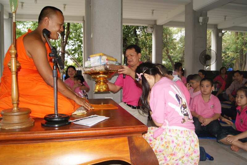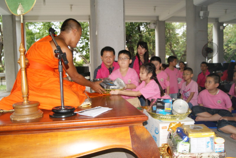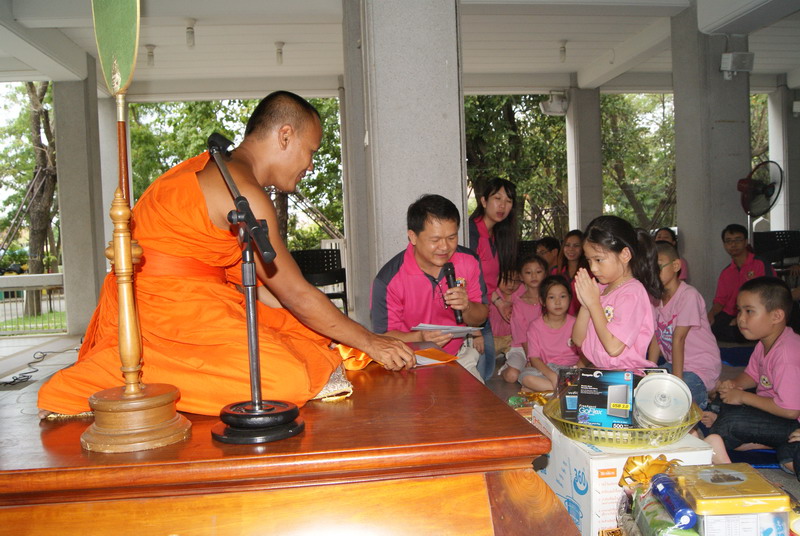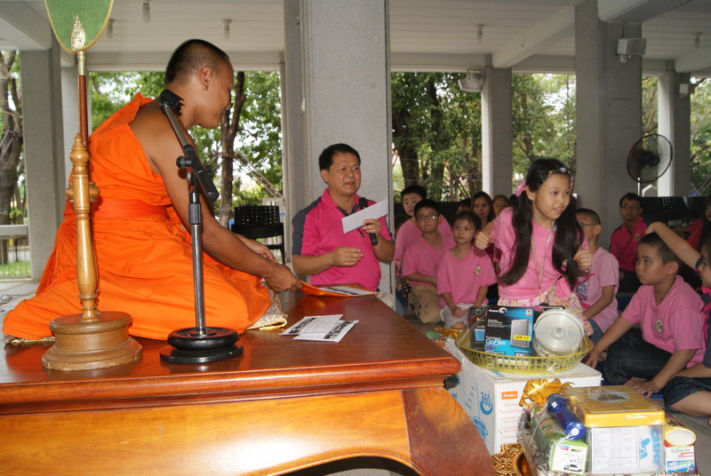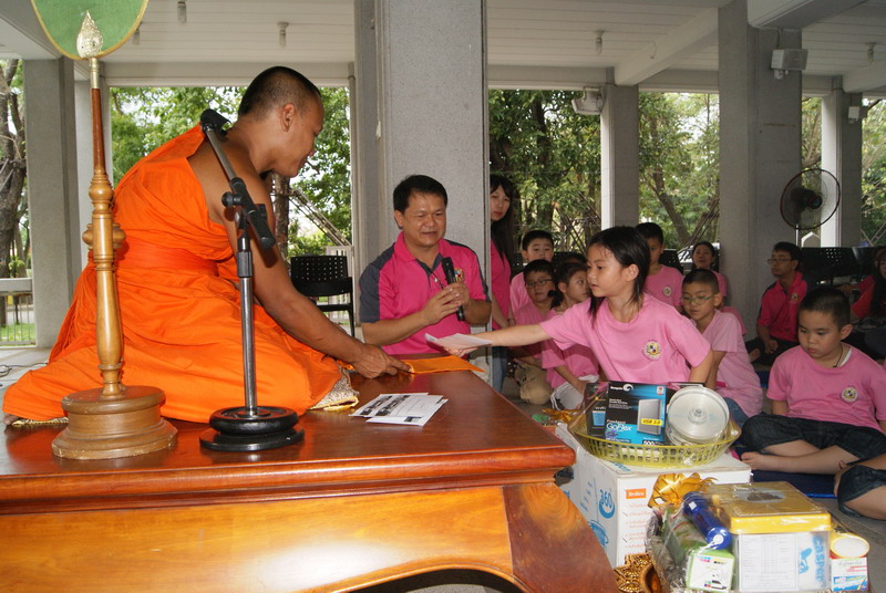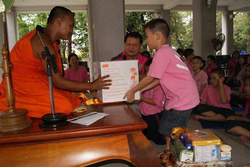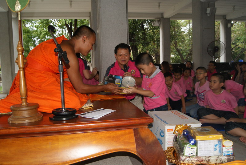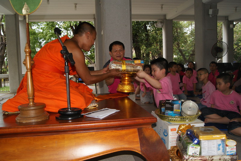 ถวายชุดสังฆทาน พร้อมถวายปัจจัย วัดญาณเวศกวัน 10,000 บาท ถวายเงินสมบททุนโครงการพี่สอนน้อง 5,000 บาท มอบของใช้ สิ่งของ เสื้อผ้า ของเล่น หนังสือ ข้าวสาร อาหารแห้ง นม ฯลฯ ที่ได้รับบริจาคจากเพื่อนๆในห้อง ป.1/1 แก่ น้องๆจาก บ้านพี่สอนน้องที่เดินทางมารับของจาก จ.กาญจนบุรี