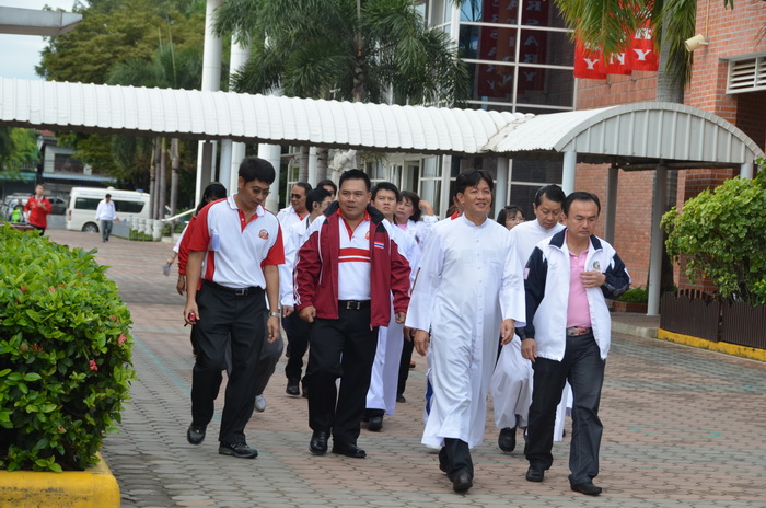 -ประธาน / คณะภราดา / คณะที่ปรึกษาฯ / สมาคมผู้ปกครองและครูฯ / สมาคมศิษย์เก่าฯ เข้าสู่ปะรำพิธี (วงโยธวาธิตบรรเลงเพลงมหาฤกษ์)