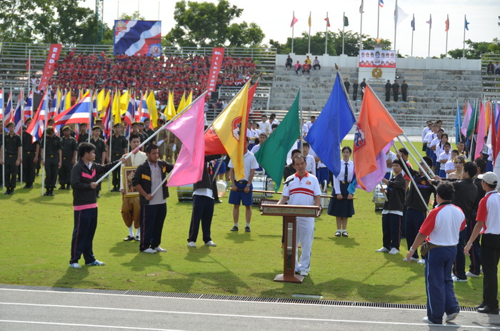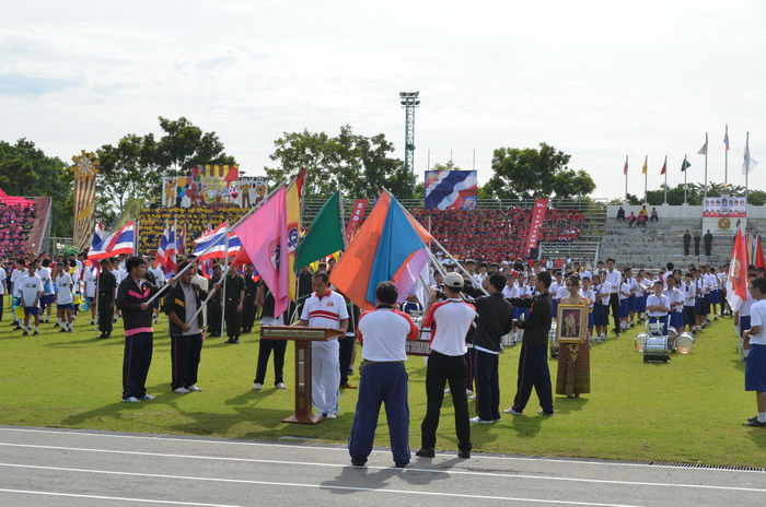 - นักกีฬาวิ่งคบเพลิงคนสุดท้ายจุดไฟในกระถาง (มาร์ชกีฬาสี) เชิญธงโรงเรียน /