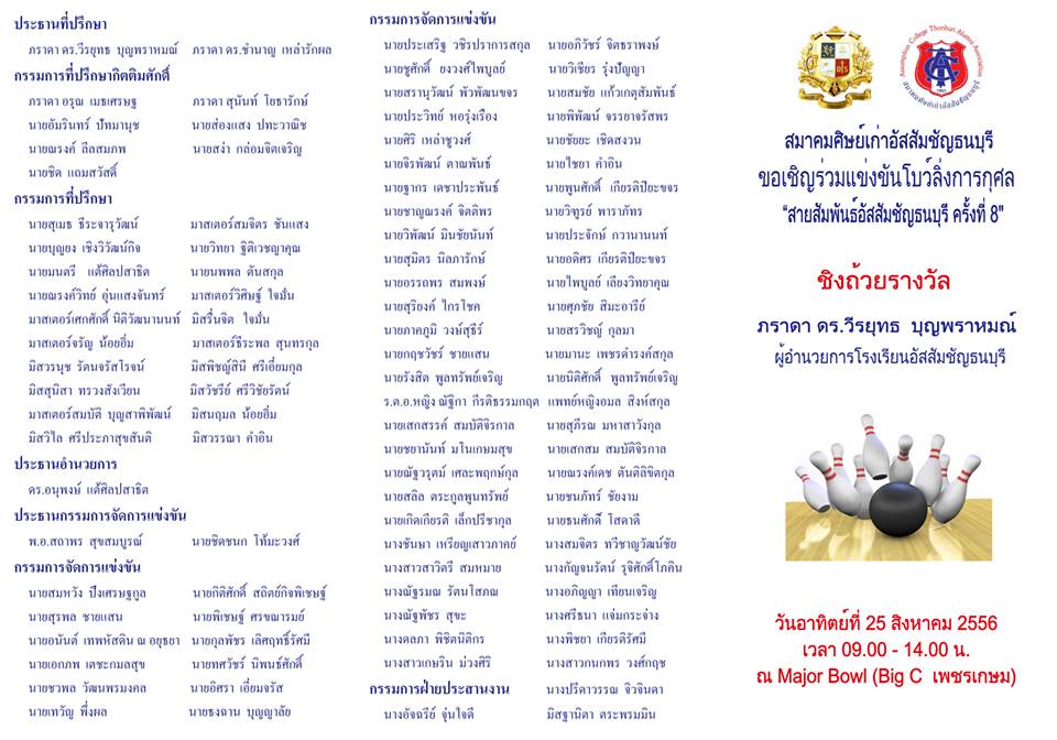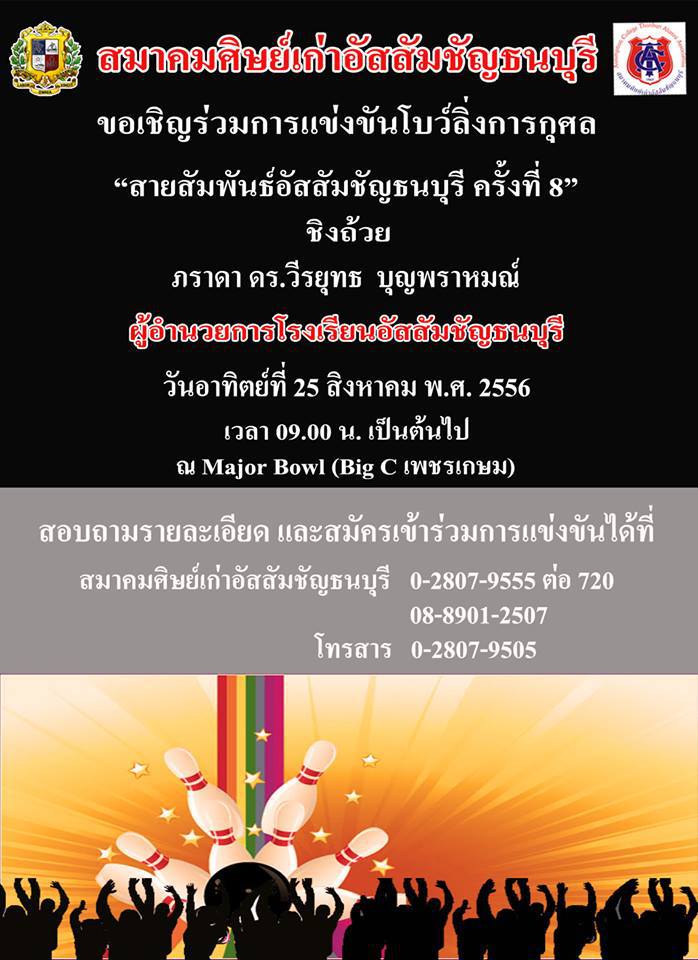 การแข่งขันโบว์ลิ่งการกุศล สมาคมศิษย์เก่าฯ "สายสัมพันธ์อัสสัมชัญธนบุรี ครั้งที่ 8" ชิงถ้วยรางวัลผู้อำนวยการโรงเรียนฯ ภราดา ดร.วีรยุทธ บุญพราหมณ์ วันอาทิตย์ที 25 สิงหาคม 2556 เวลา 09.00 - 14.00 น.