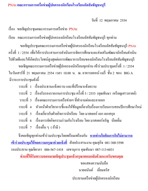 ขอเชิญประชุมคณะกรรมการเครือข่ายผู้ปกครองนักเรียนโรงเรียนอัสสัมชัญธนบุรี PNAt
