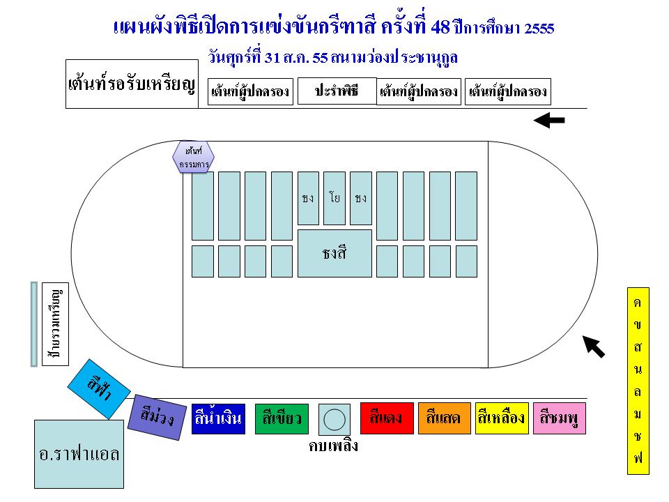 - ประธานกล่าวให้โอวาทและเปิดการแข่งขันกรีฑาสี (ยิงปืน / ปล่อยแพรป้าย)