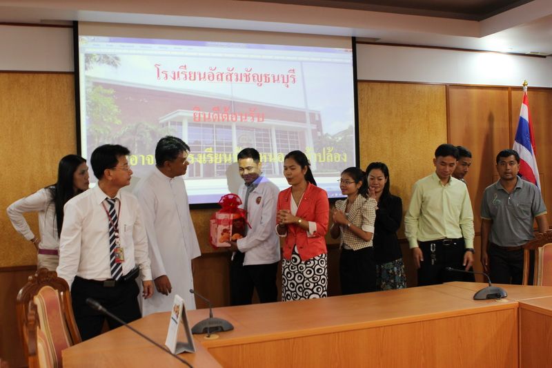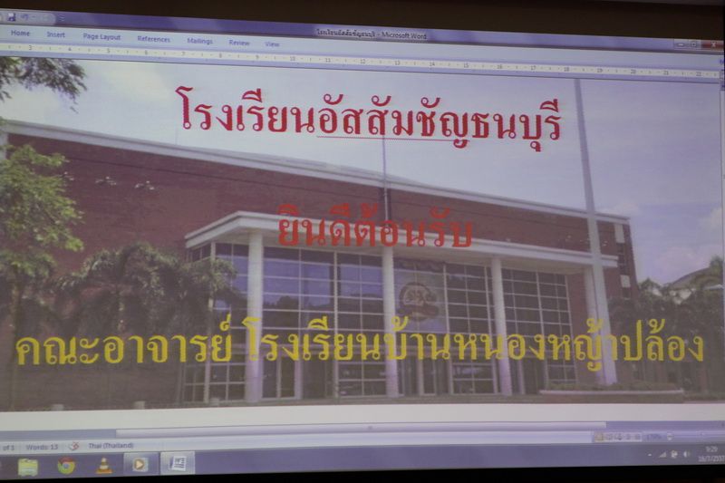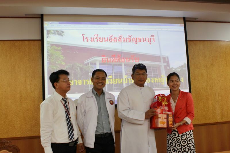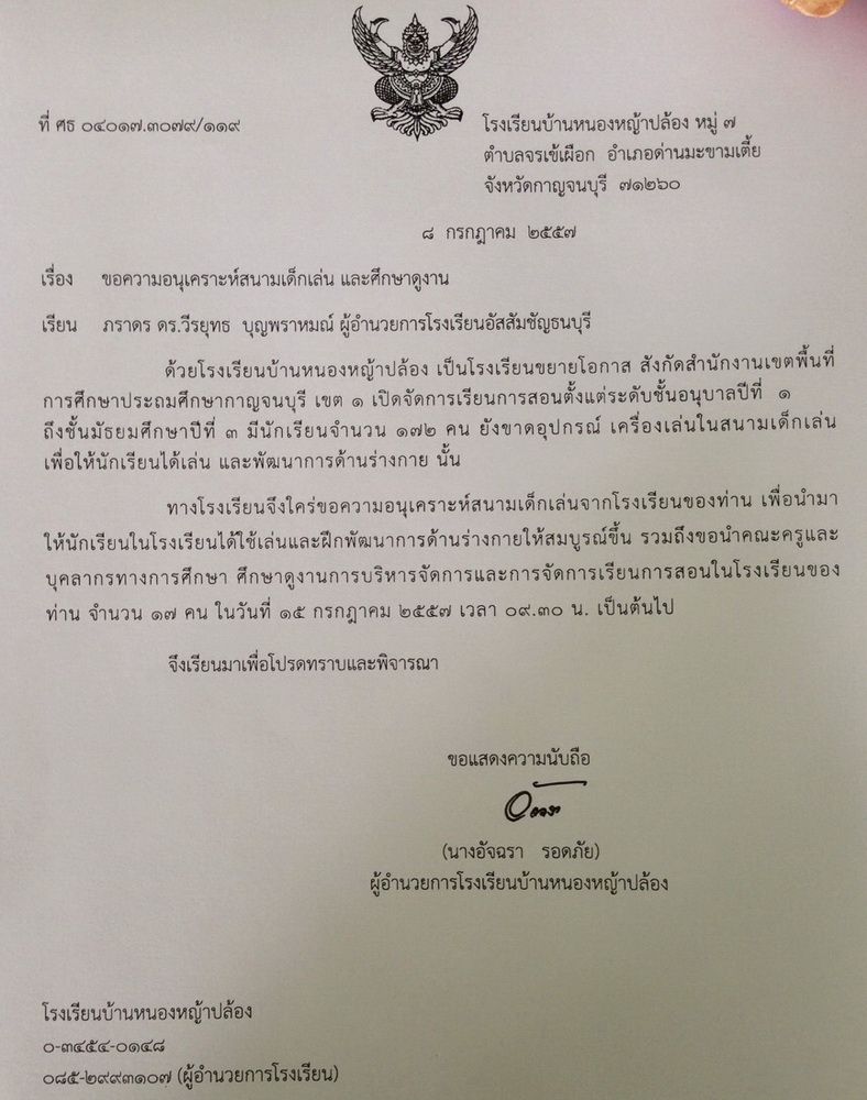 นางอัจฉรา รอดภัย ผู้อำนวยการ โรงเรียนบ้านหนองหญ้าปล้อง ต.จรเข้เผือก อ.ด่านมะขามเตี้ย จ.กาญจนบุรี เข้าพบ ท่านผู้อำนวยการ ภราดา ดร.วีรยุทธ บุญพราหมณ์ เรื่อง ขอความอนุเคราะห์สนามเด็กเล่น และศึกษาดูงาน..วันพุธที่ 16 กรกฎาคม 2557 เวลา 09.30 น.