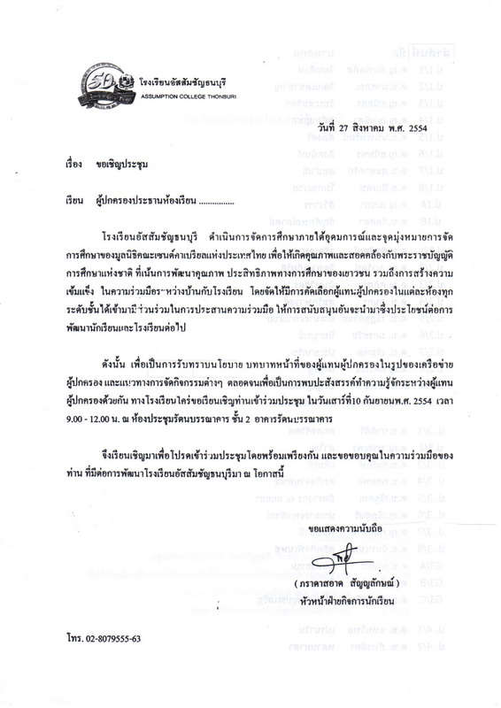 ขอเชิญประชุมคณะกรรมการเครือข่ายผู้ปกครองนักเรียน โรงเรียนอัสสัมชัญธนบุรี ACTPN ประชุมใหญ่สามัญครั้งที่ 2 / 2554 เพื่อให้การประสานการดำเนินการจัดการศึกษา และส่งเสริมพัฒนานักเรียนดำเนินไปด้วยดี และให้เกิดประโยชน์สูงสุดต่อการพัฒนาการเรียนของนักเรียนโรงเรียนอัสสัมชัญธนบุรีขอเชิญคณะกรรมการเครือข่ายผู้ปกครองนักเรียนทุกท่านเข้าร่วมประชุม ในวันเสาร์ที่ วันที่ 10 กันยายน พ.ศ. 2554 เวลา 09.00 12.00น.