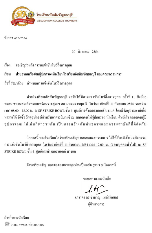 โอกาสนี้ ทางโรงเรียนใคร่ขอเรียนเชิญท่านและคณะกรรมการ ได้ให้เกียรติเข้าร่วมกิจกรรมการแข่งขันโบว์ลิ่งการกุศล ในวันอาทิตย์ที่ 11 กันยายน 2554 เวลา 12.00 น. (รอบบุคคลทั่วไป) ณ SF STRIKE BOWL ชั้น 4 ศูนย์การค้า เดอะมอลล์ บางแค