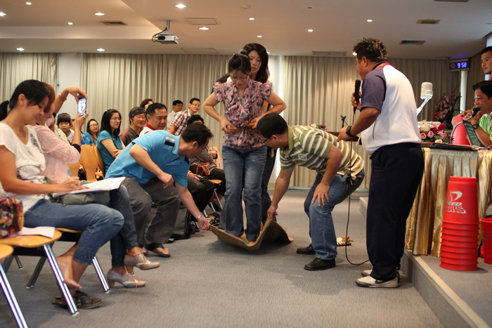 กติกา ผู้แข่งขันจะมีแผ่นฟิวเจอร์บอร์ดขนาด A4 โดยจะใช้มือสองข้างวางแผ่นฟิวเจอร์บอร์ดก่อนแล้วค่อยๆก้าวตาม วิ่งไปกลับ สลับชาย หญิง หรือ เรียงลำดับตามสะดวกใครเสร็จก่อน ชนะ(มีภาพประกอบ)