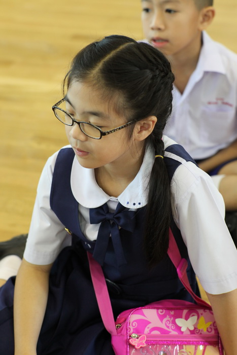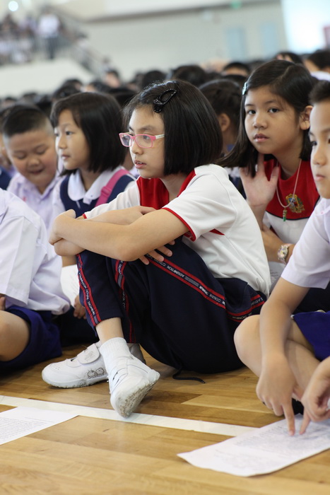 07.50 น. นักเรียนชั้น ป.3 - ป.5, ม.1 - ม.6 เข้าแถวตามผัง