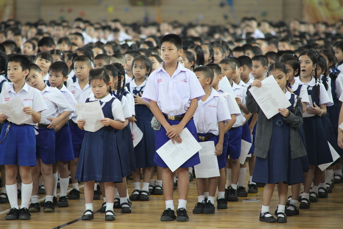 07.50 น. นักเรียนชั้น ป.3 - ป.5, ม.1 - ม.6 เข้าแถวตามผัง