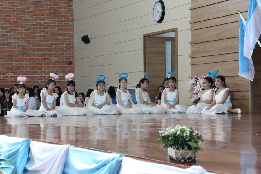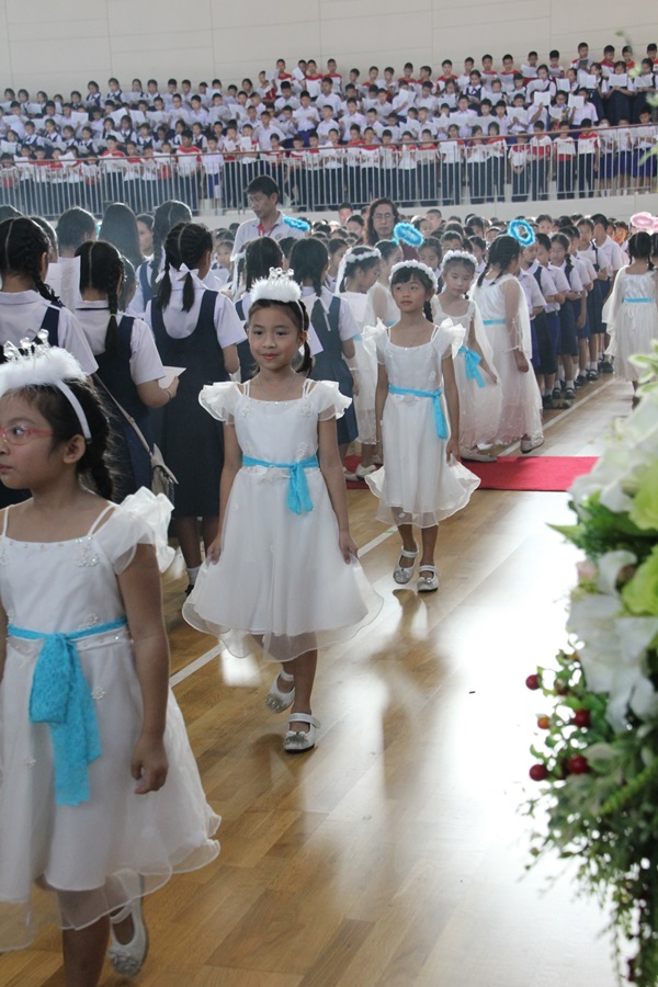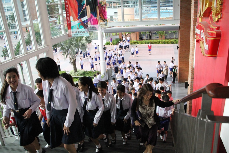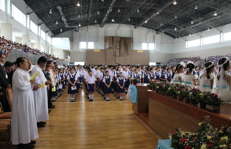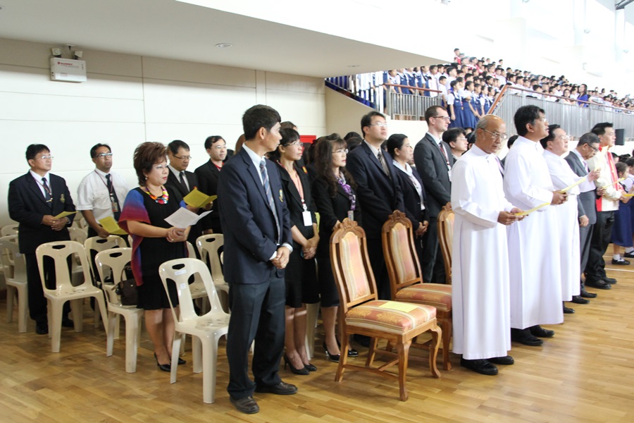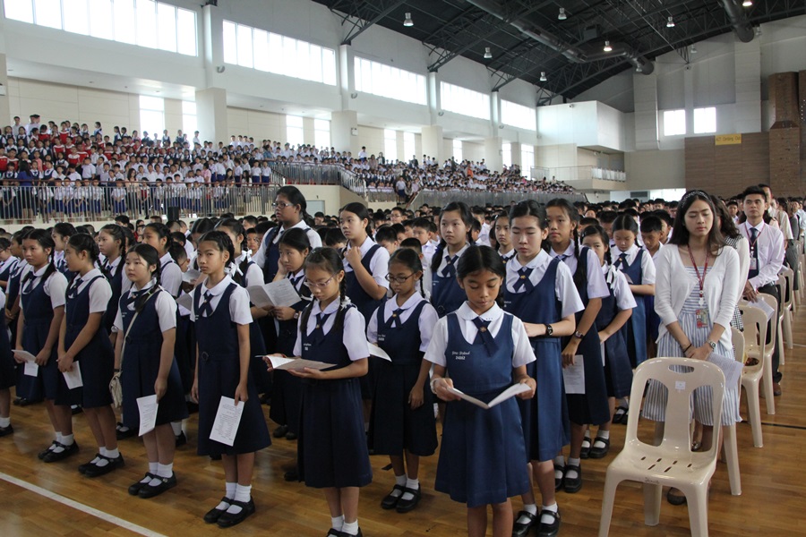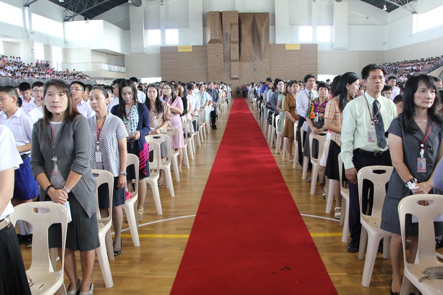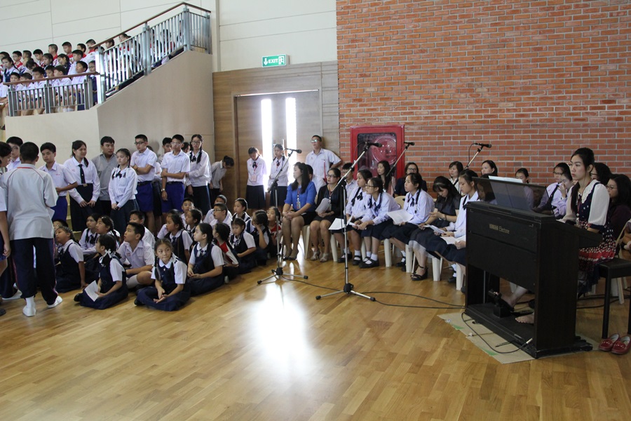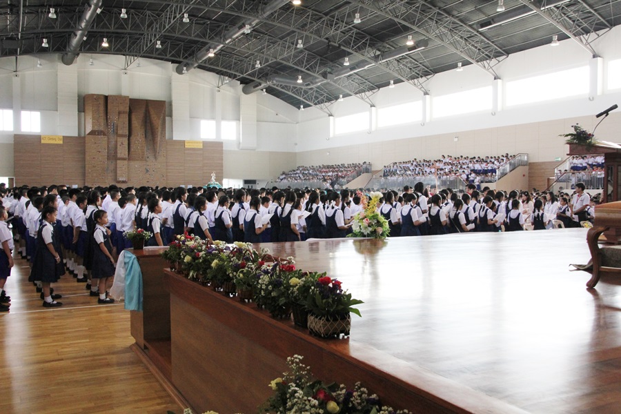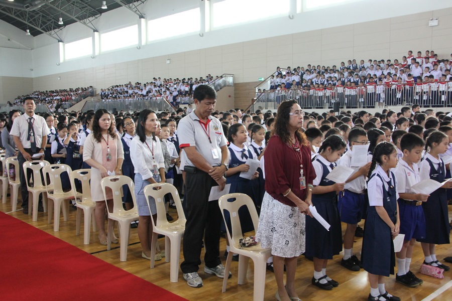 เวลา 07.50น. นักเรียนระดับชั้น ป.1-มัธยม 6 เข้าแถวร้องเพลงชาติ สวดมนต์