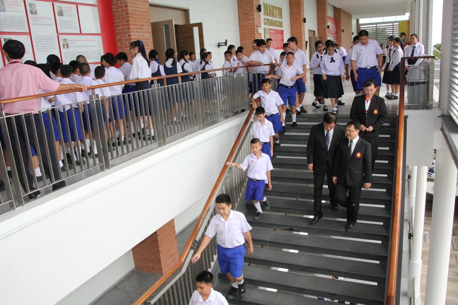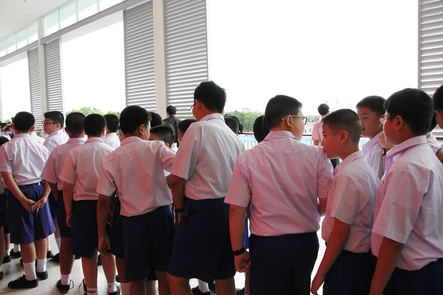 เวลา 07.50น. นักเรียนระดับชั้น ป.1-มัธยม 6 เข้าแถวร้องเพลงชาติ สวดมนต์