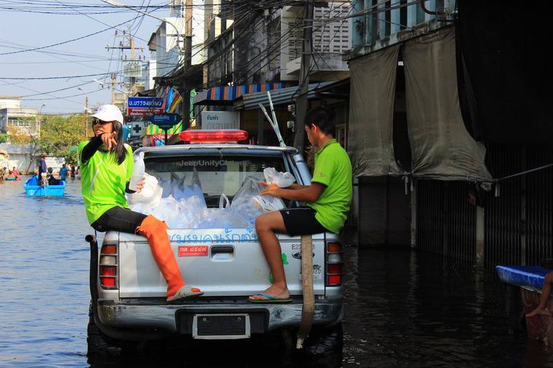 ชมรมออฟโรดจาก website WeekendHobby.Com ที่นำถุงยังชีพ ข้าวกล่อง น้ำดื่ม ไปช่วยผู้ประสบภัยชุมชนรอบๆโรงเรียน