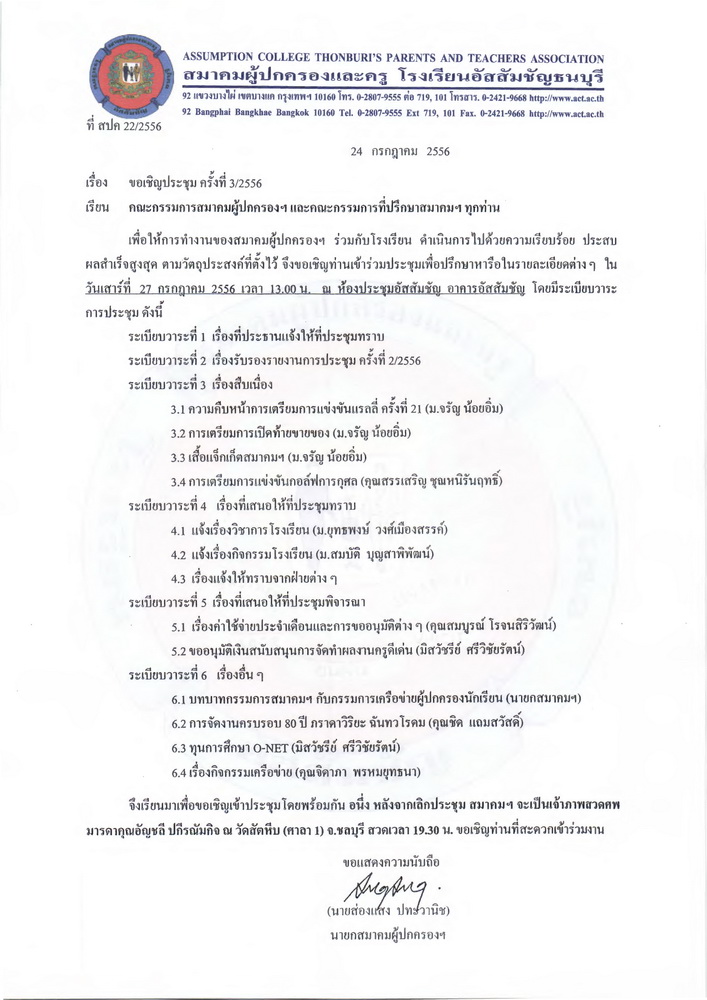 การประชุมคณะกรรมการสมาคมผู้ปกครองและครู ครั้งที่ 3/2556วันเสาร์ที่ 27 กรกฎาคม 2556 เวลา 13.00 น. ห้องประชุมอัสสัมชัญ โดยมีคุณส่องแสง ปทะวานิช เป็นประธานการประชุม ภราดา ดร.วีรยุทธ บุญพราหมณ์ และคณะกรรมการที่ปรึกษา