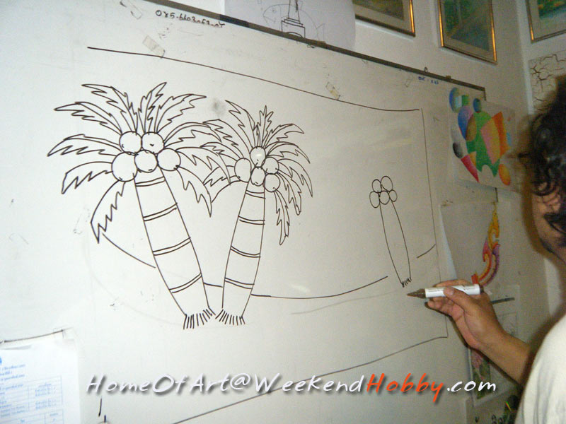 การวาดต้นมะพร้าว ถ้าให้เด็ก ๆ เริ่มต้นตามลำดับ ขั้นต่อไปจะวาดต้นหมาก ต้นปรง พืชชนิดเดียวกัน