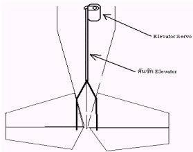 รูปข้างบนแสดงการติดตั้งระบบคันชักของ Elevator ให้สังเกตว่าเราจะต้องพยายาม ให้ตัวคันชักเคลื่อนที่ อยู่ในแนวเส้น Center lineของลำตัวเครื่องบิน เพื่อให้ส่วนปลายของคันชักที่ไปต่อกับ Elevator แต่ละด้านมีขนาด การเคลื่อนที่เท่ากัน ให้สังเกต ตำแหน่งของ Elevator Servo ที่จะทำให้ตัวคันชักอยู่ในแนว Center line ให้สังเกตว่าตัวคันชัก จะเป็นตัวกำหนด ตำแหน่ง ที่จะติดตั้ง Elevator Servo