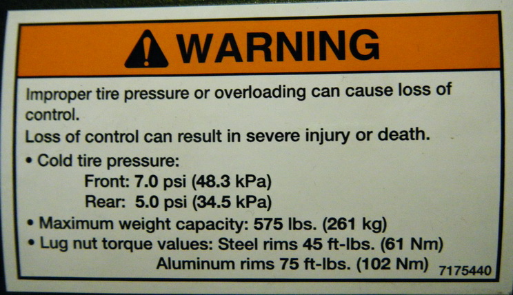 ยางหลัง ถ้า ATV คันนั้นบรรทุกสัมภาระเพิ่ม หรือถ้า ATV คันนั้นเป็นรุ่นที่ซ้อนได้ ก็สามารถเติมลมได้มากขึ้นแต่ไม่ควรเกิน 8 ปอนด์ ครับ