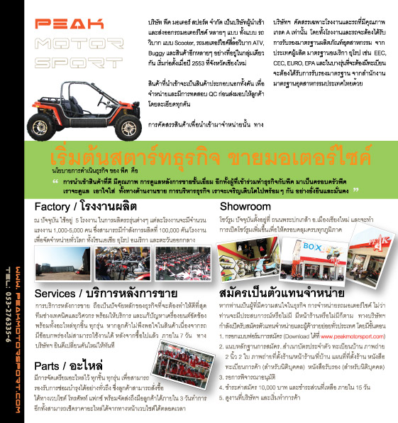 โอกาสทางธุรกิจในการสร้างผลกำไร และเป็นกิจการที่ยั่งยืน อัตราการเจริญเติบโตสูง หากท่านเป็นผู้ที่มีความสนใจในธุรกิจการจำหน่ายรถมอเตอร์ไซค์ ทั้งที่มีประสบการณ์และมีร้านค้าจำหน่ายอยู่แล้วหรือยังไม่มีร้านและไม่เคยทำมาก่อน ทางบริษัท พีค มอเตอร์ สปอร์ต จำกัด ได้เปิดรับสมัครตัวแทนจำหน่ายทั่วประเทศ โดยจะใช้เงินลงทุนเริ่มต้นเพียง 89,000 บาท เท่านั้นแต่ได้ผลตอบแทนที่สูงโดยมีเกณฑ์ในการคัดเลือกจะใช้ระบบ First Come First Serve ใครมาก่อนก็จะได้รับการพิจารณาเพื่อลงพื้นที่นั้นๆ ก่อน ซึ่งการเป็นตัวแทนจำหน่าย แบ่งเป็น 2 แบบ คือ1. รายใหญ่ (ระดับจังหวัด) 2. รายย่อยทั่วไป