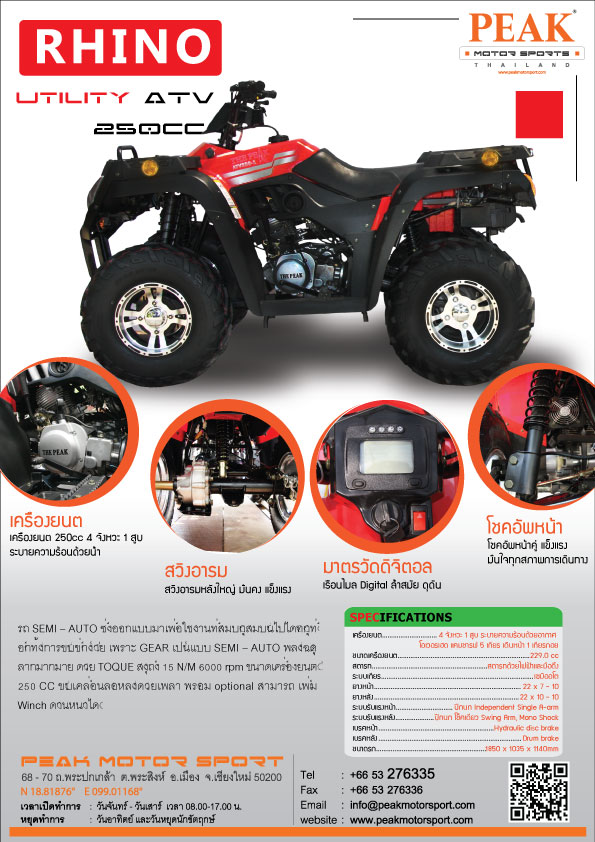 รถ Utility ATV ขนาด 250 cc ที่ดุดัน แข็งแรง ขับเคลื่อนล้อหลังด้วยเพลา สมรรถนะเยี่ยม เครื่องยนต์ใหญ่สมบุกสมบัน ใช้งานลุยในทางวิบาก เข้าป่าเดินทางไกล ลุยน้ำ ไต่เขาได้ ด้านหน้า-หลังสามารถบรรทุกสัมภาระได้มาก