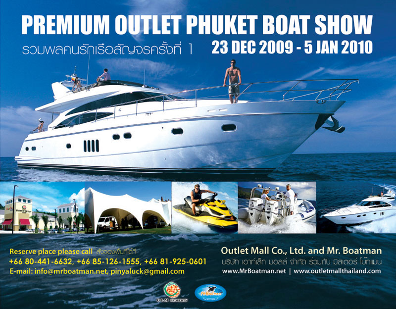 โดยอยากจะขอเชิญพี่น้องกลุ่มคนรักเรือ และผู้สนใจในกิจกรรมทางน้ำทุกท่าน เข้าเป็นส่วนหนึ่งของ งาน Premium Outlet Boat Show ที่จะถูกจัดขึ้นเป็น Outdoor ตรงสนามหญ้าด้านหน้า Premium Outlet จังหวัด ภูเก็ต ในวันที่ 23 ธันวาคม 2552 - 5 มกราคม 2553 ครับ โดยงานนี้ได้ถูกจัดและดำเนินงานโดย Outlet Mall Co.,Ltd. และ Mr. Boatman ครับ