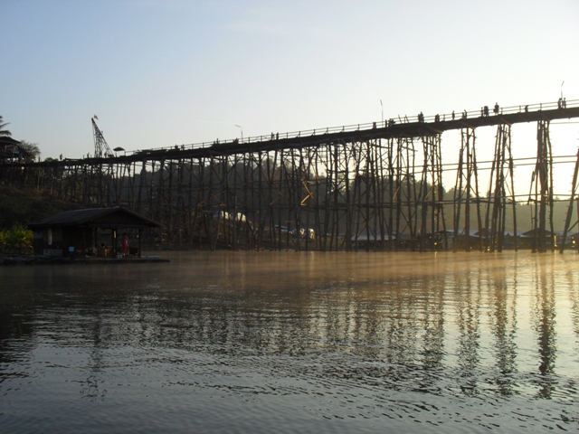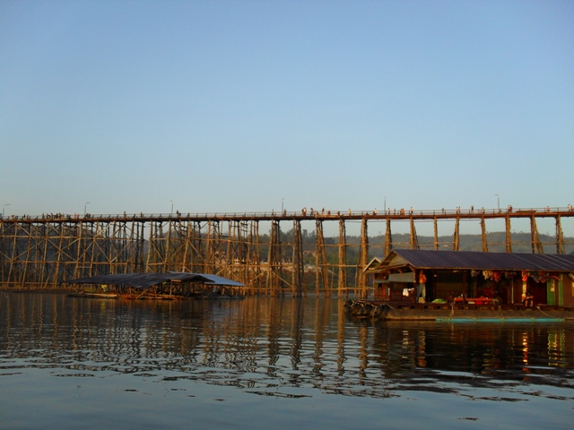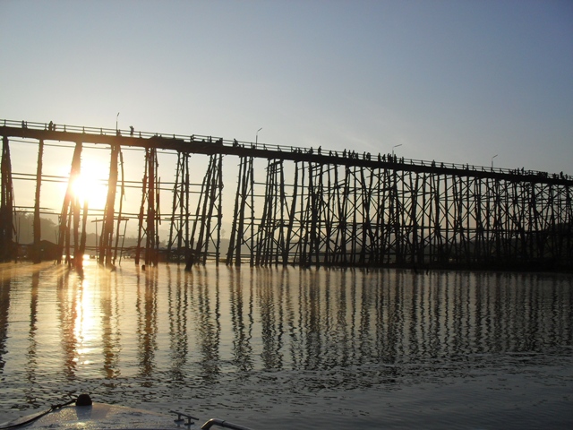 ขับเรือไปชมสะพานมอญยามเช้า มีคนมาเดินตั้งแต่ยังไม่แดด จนถึงเที่ยงคืนยังมีคนเดินอยู่เลย