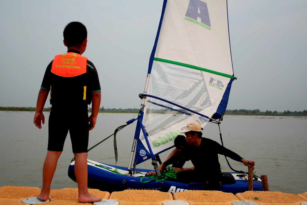 ของผมเพิ่งลองวิ่งในทะเลครั้งเดียวครับ ไม่ค่อยมีเวลา ก็วิ่งสนุกดีครับ แต่เวลาวิ่งทวนลมรู้สึกมันไม่ค่อยจะไป คือเราก็ยังไม่คุ้นเคยกับมันด้วยแล้วคลื่นลมก็แรงมาก แต่ก็ดีตรงที่การลอยตัวดีแม้คลื่นจะใหญ่ ลองเล่นแบบวินเซิร์ฟก็สู้แรงไม่ไหวถ้าแรงดีๆๆก็น่าสนุกหรือถ้าลมไม่แรงก็ยังพอไหว ก็ยังหาโอกาสเล่นอยู่เพราะมันให้ความเพลิดเพลินดี ผมเห็นของน้าตุ้มน่าจะยังประกอบไม่ถูกตรงส่วนที่เป็นเชือกหัวเรือที่ยึดเสาคือที่เสาจะมีแคล้มรัดปลายท่อนแรกจะมีแคล้มป์รัดเพื่อเป็น support รองรับกับบูม แล้วเชือกจะต้องรัดเหนือบูม เพราะถ้ารัดแบบน้าตุ้ม จะทำให้เชือกรูดรั้งกับใบที่เสาได้